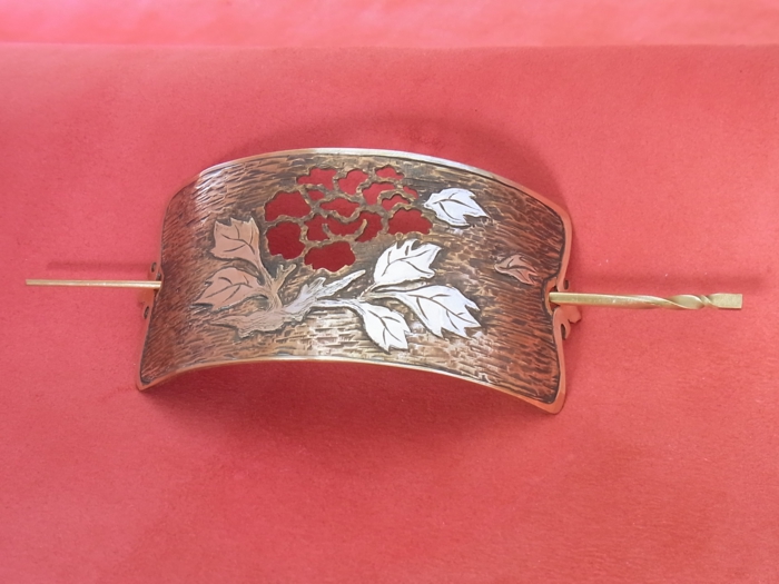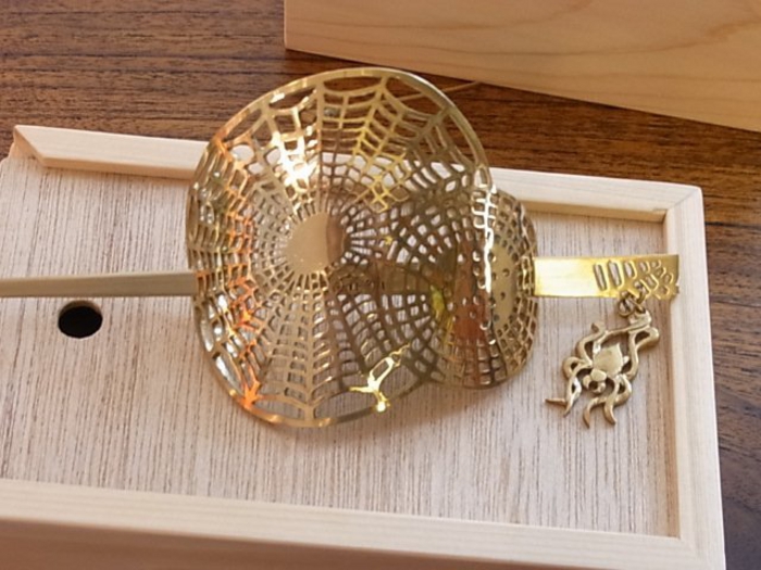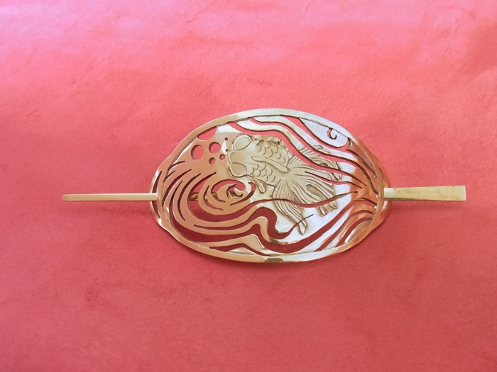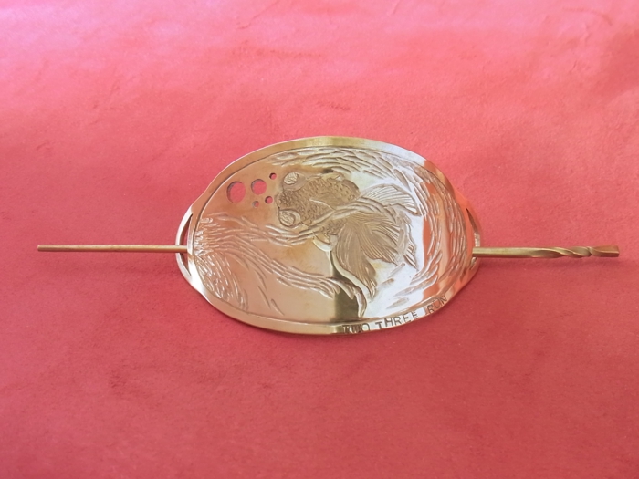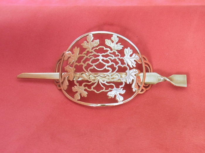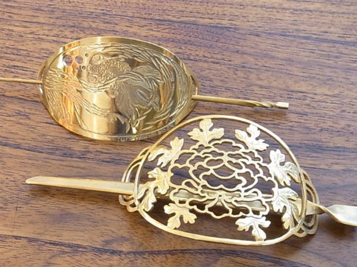 真鍮のかんざし【参考商品】 <説明> >素材: 真鍮削りだし透かし彫りで描かれた文様と、しっかりと磨きこんだ本体が、さり気なく髪を飾るように、と真鍮で制作しました。オーダーメイドでのご注文にも応じますので、お気軽にご相談ください。