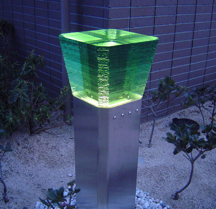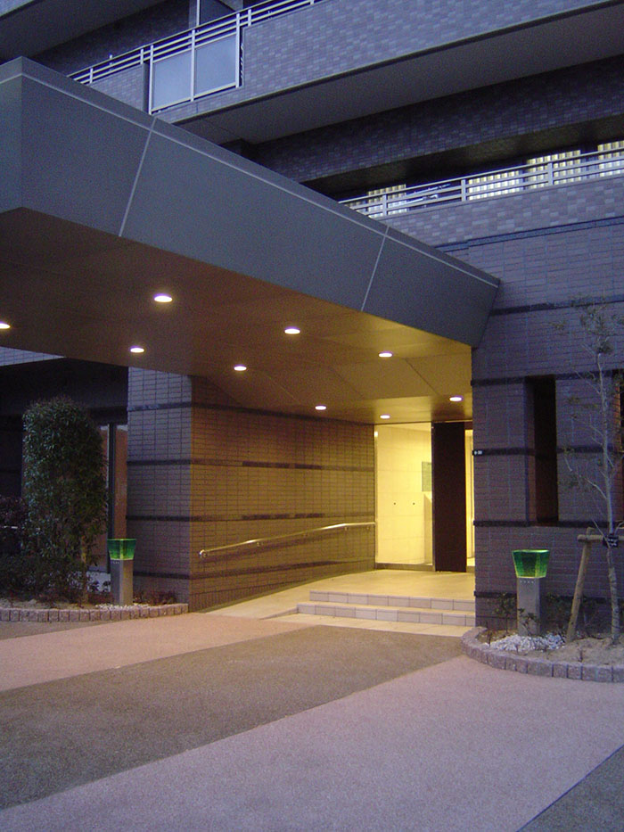 穴吹工務店 サーパス長浜豊公園照明 (滋賀県)*株式会社 黒壁 (ガラス工房)との共同制作です。 <商品説明> >素材: ステンレス・ガラス*株式会社 黒壁 (ガラス工房)との共同制作です。ガラス板を積み重ねて照明を形づくっています。夜はこのように光ります。エントランス 外観(両端に置かれているのが照明です)中庭にも照明を設置しています。夜間にはこのように光ります。