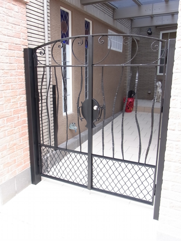 玄関鉄扉 (京都府) <商品説明> >素材: 鉄材・鍛鉄・ウレタン塗装>サイズ: h1800 :w14000嵐山の個人のお宅の玄関の門として設置しました。鉄の扉ですが空間をゆったりとって、軽やかに仕上げました。