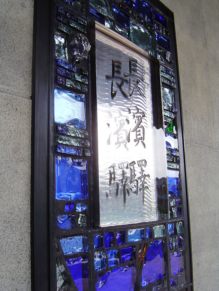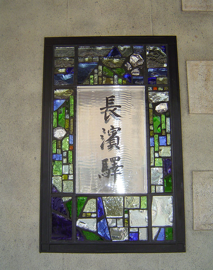駅の西口の銘板をダルガラスを用いて作成しました。こちらは、駅の東口に設置しています。