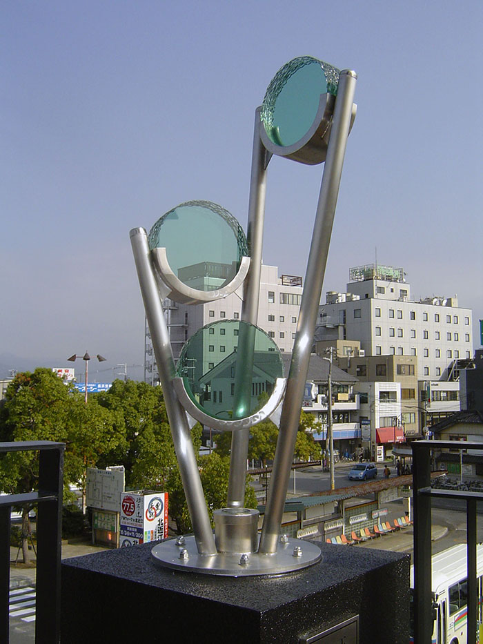 駅の二階部分(屋外)に設置されたモニュメントを制作いたしました。板ガラスを積層したものと、ステンレスを組み合わせています。
