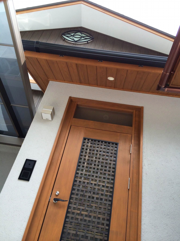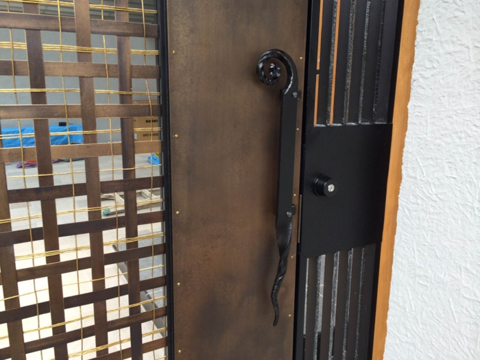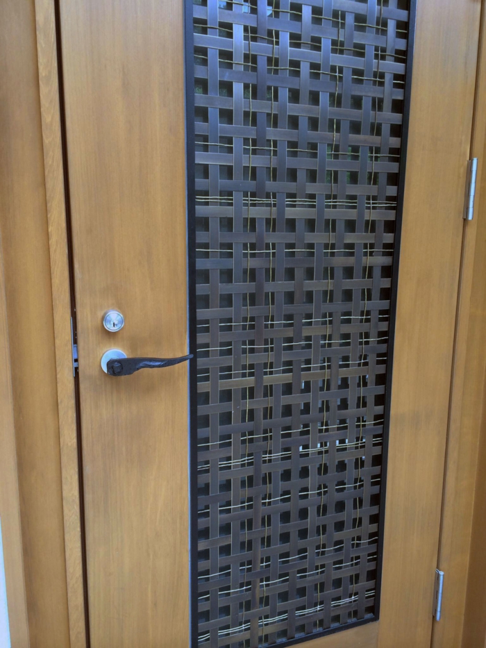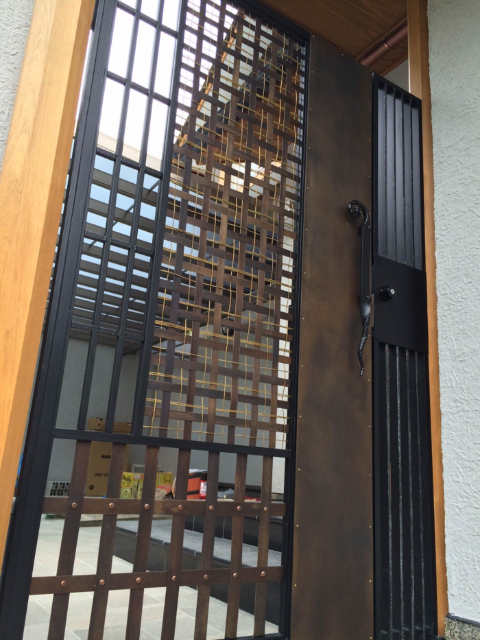 個人宅の玄関扉、門扉を真鍮を編み上げた網と鉄で、