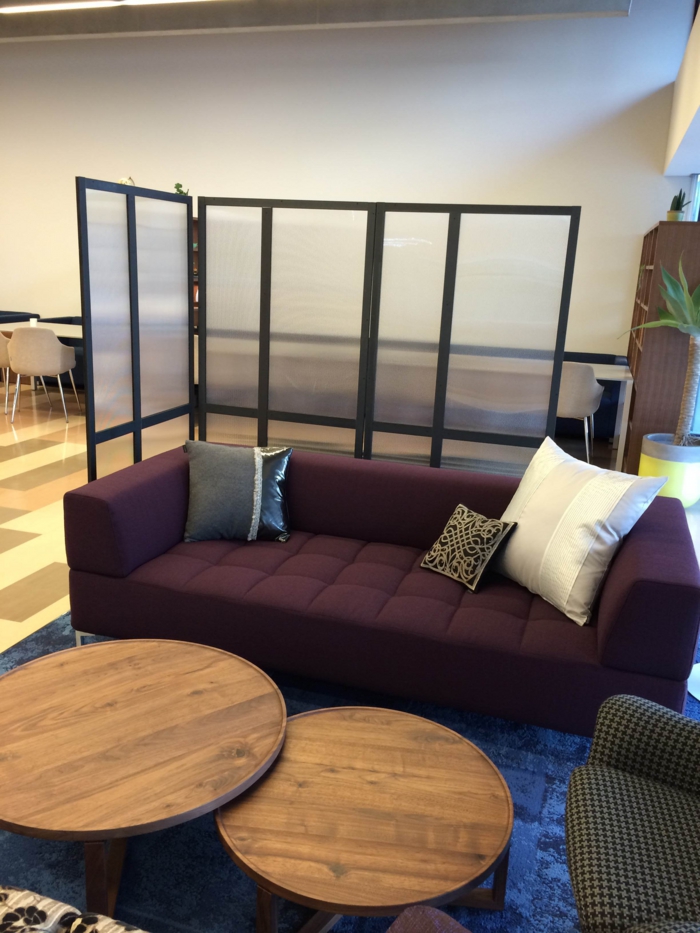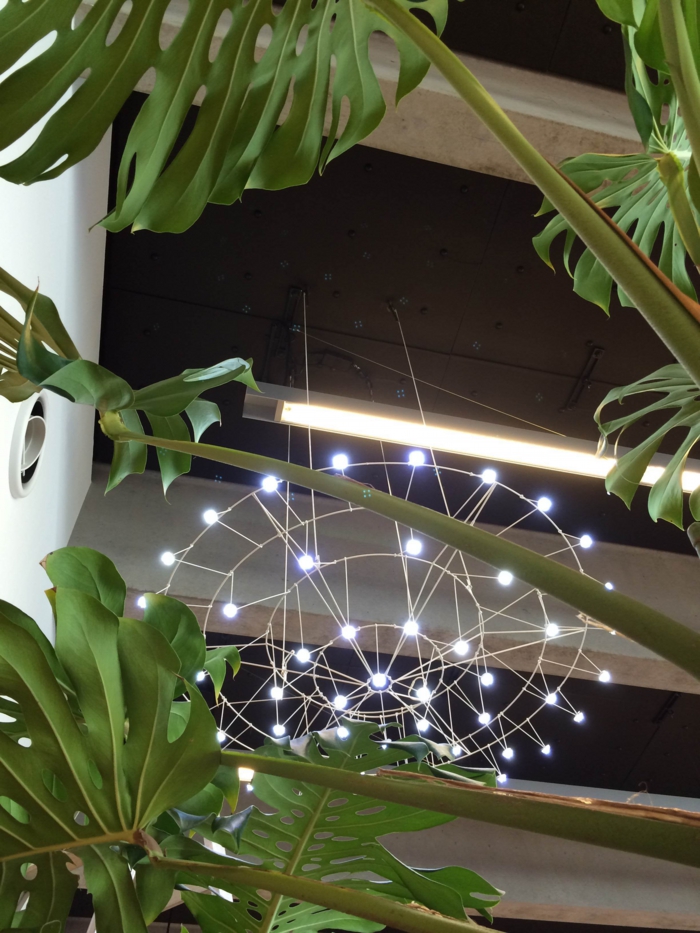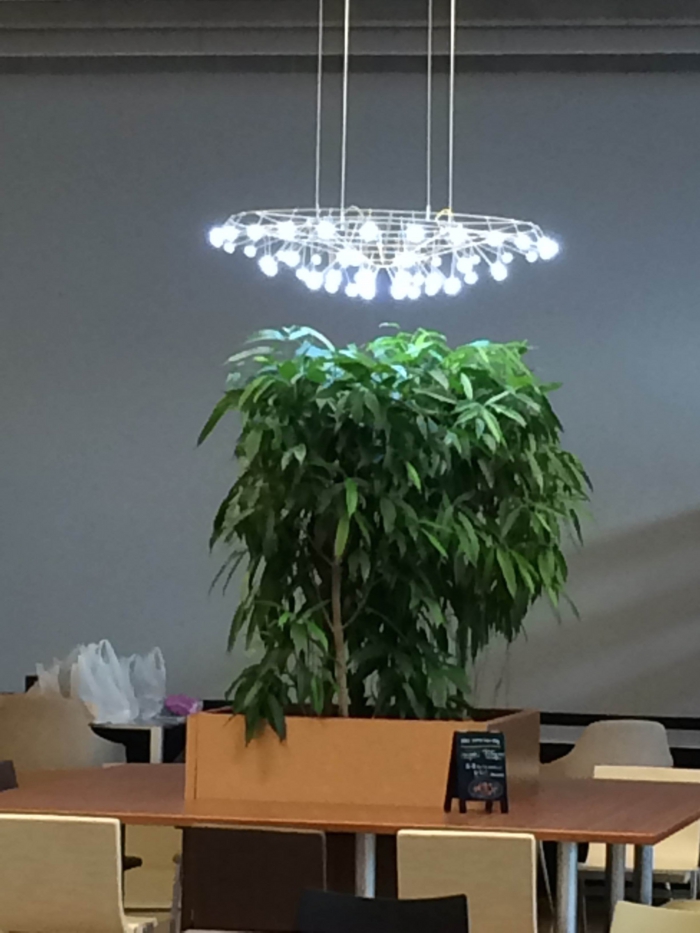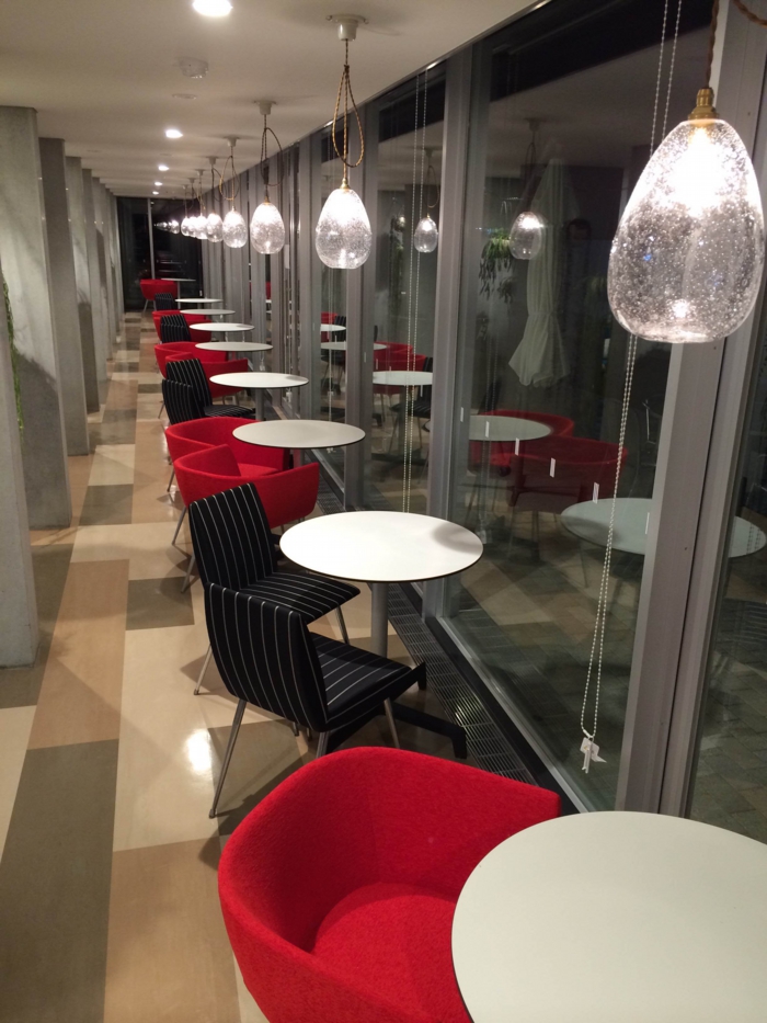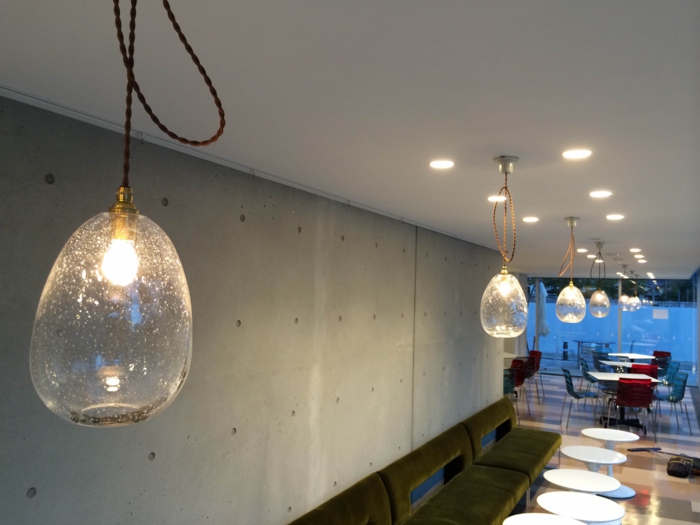 京都のおしゃれ学生食堂 (京都府) <説明> 監修:アーキヴィジョン >素材パーテーション :鉄・アクリル・クリア塗装LEDシャンデリア :鉄・LEDカウンターテーブル :鉄・クリア塗装テーブルランプ :鉄・ガラスペンダントランプ:吹きガラス・真鍮