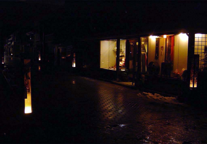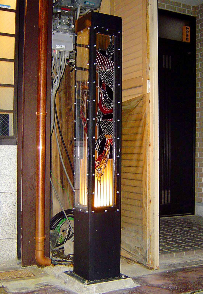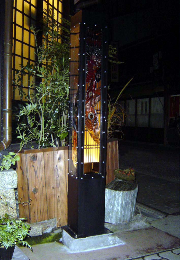 ステンドグラス 街行灯 (滋賀県)*株式会社 黒壁 (ガラス工房)との共同制作です。 <説明> 鉄とステンドグラスを用いて、街行灯を製作しました。光源のある底側から徐々に明るさが変わって見えます。このように街角に設置されています。夜に通りを眺めると、このように浮かびあがります。