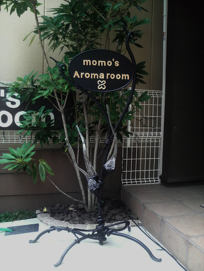 モモズアロマルーム 看板 (京都府) <説明> >素材 : 鉄・真鍮・ガラス>サイズ : 1500×800×400 (縦×横×奥行き)>仕上げ : ウレタン塗装鍛鉄とガラスを組み合わせた、背の高さほどの大きさの看板です。文字は真鍮板を切り抜いて、看板にしています。柔らかな形状のガラスには、気泡を入れています。光が当たると違った表情になります。