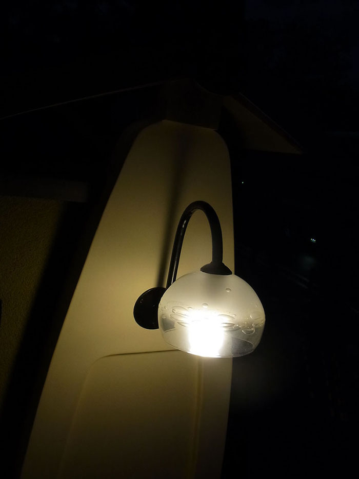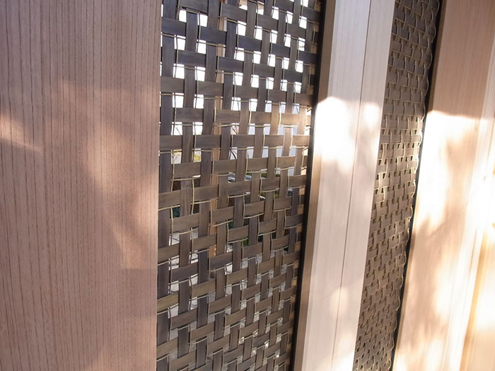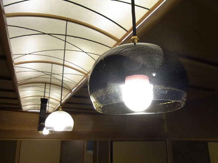 門扉は、無垢の木の建具に、真鍮を網のように編み込んだものからできています。外灯は、鍛造でつくりだしたアーム、吹きガラスでできたランプシェードになっています。室内の照明は、高い天井を生かし、つや消しと、黒地にドットのガラスのランプシェードが、交互に並んでいます。