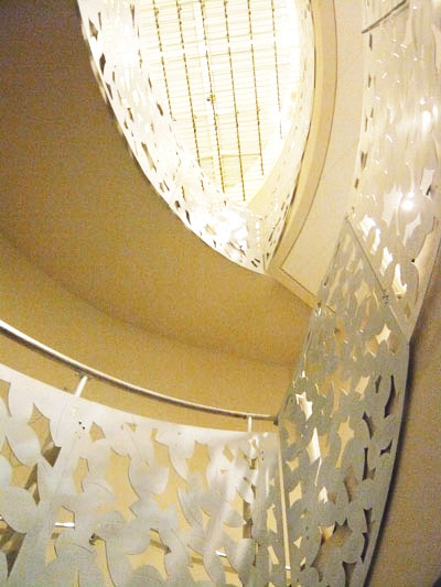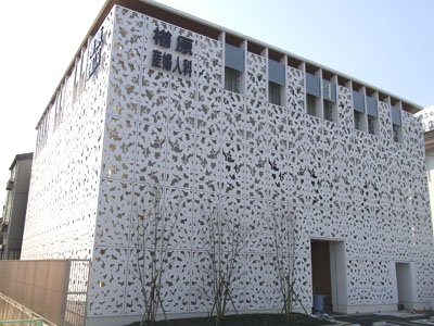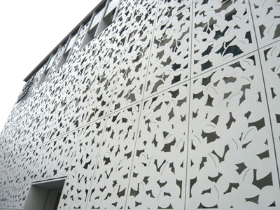 外壁は葉っぱの重なりをモチーフにしたパネルで建物全体を覆っており、離れてみると、レースの模様のようにも見えます。