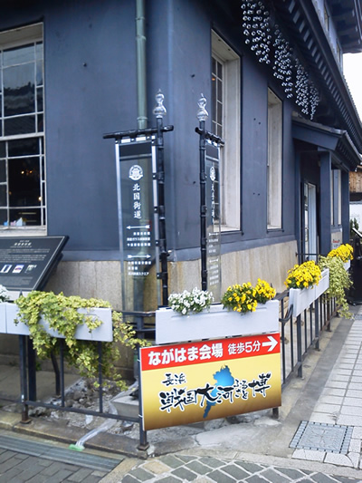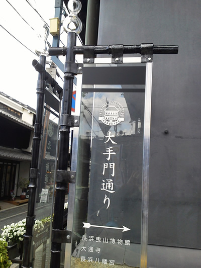 長浜観光案内標識 (滋賀県長浜市) <説明> >素材: 鉄(防蝕加工にウレタン仕上げ) ・ガラス>サイズ:2600x650x250※ひょうたんの吹きガラスは(株)黒壁との共作です。プレートフィルムを挟み込んだガラスにカッティングシートを挟んで、文字が表示されています。「長浜戦国大河ふるさと博」の時期にあわせて、戦国時代ののぼりを思わせる造形になっています。