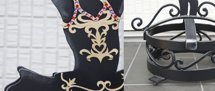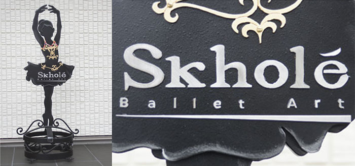 Skholé さま看板 (京都府) <説明> >素材: 鉄・ステンレス・真鍮・ラインストーン等京都北山にオープンするバレエスタジオ「Skholé」さま用に、バレリーナの姿をした看板を納品しました。バレリーナの少女が踊る姿と、鍛鉄で作った台座とを組み合わせています。衣装(チュチュ)の華やかさを表現するために、ラインストーンや真鍮をポイントに、使用しています。ロゴも金属で、作っています。