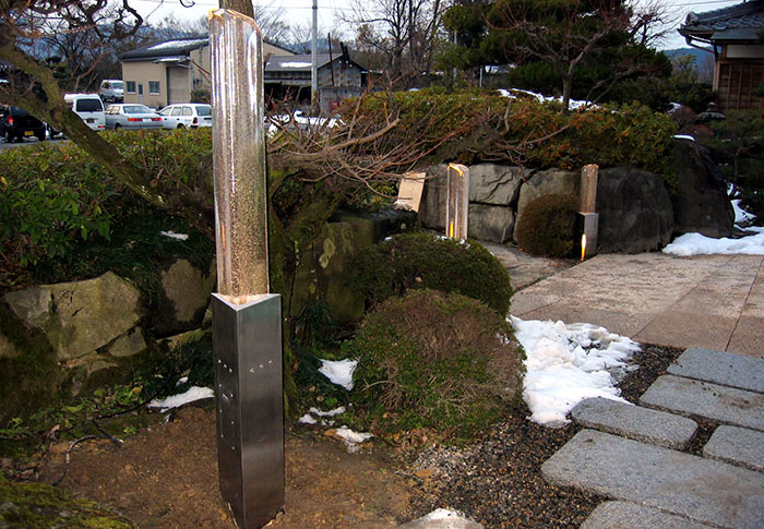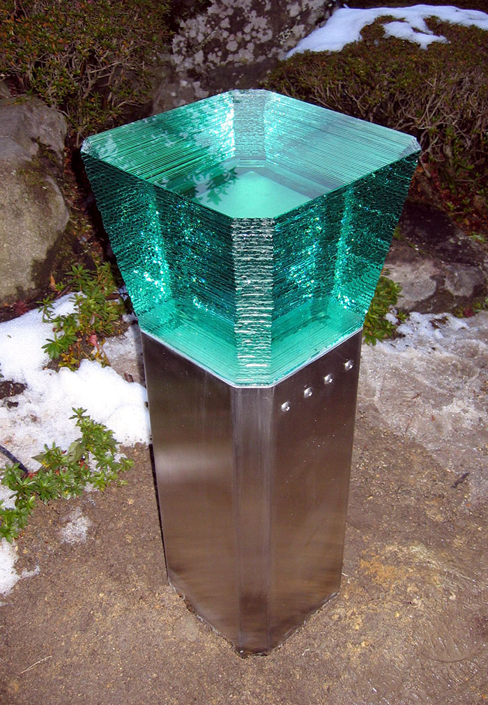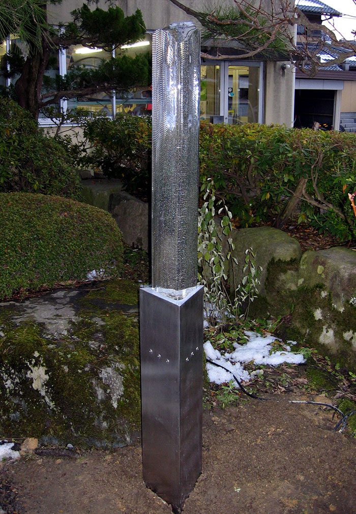 個人宅 照明 (滋賀県)*株式会社 黒壁 (ガラス工房)との共同制作です。 <説明> >素材: ガラス・ステンレスガラスを積層したものを照明にしています。お宅の庭にこのように設置しています。細かい模様の入ったガラスの塊です。三角形の土台には照明を仕込んでおり、細かい模様が照明を反射します。合計3つのサイズの異なるものをお宅の入り口に設置しました。照明の電源を入れると光ります。