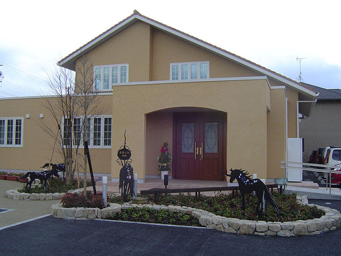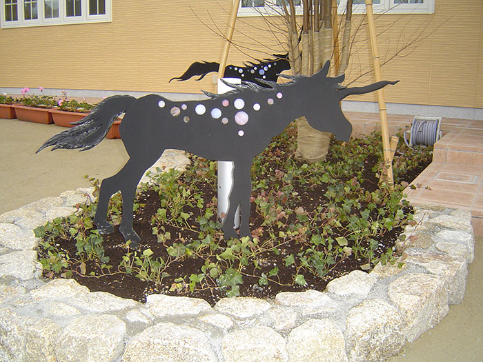 スリムで元気なユニコーン・全部で、4体を設置しています。クリニック入り口前の花壇部分に、1体ずつ点在しています。