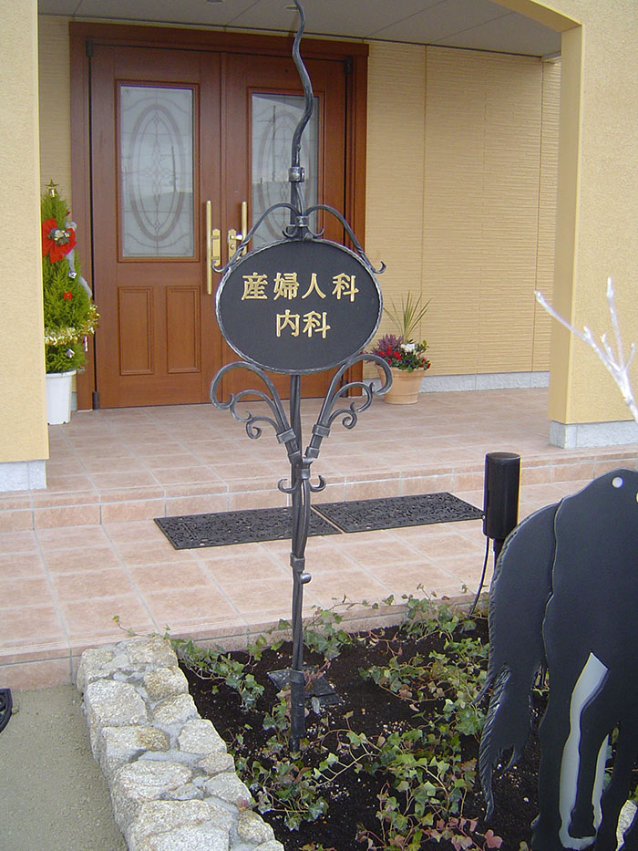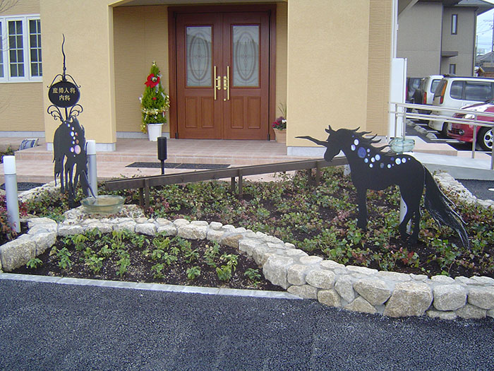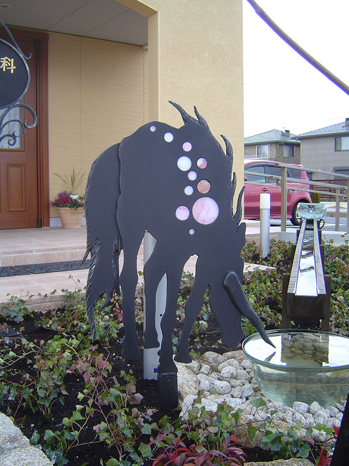 こちらは花壇の中に立った姿で設置しました。一回りちいさな「こども」のユニコーンもいます。クリニックの看板は鍛鉄で、文字は真鍮版の切り抜いたもので作製しています。
