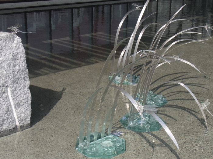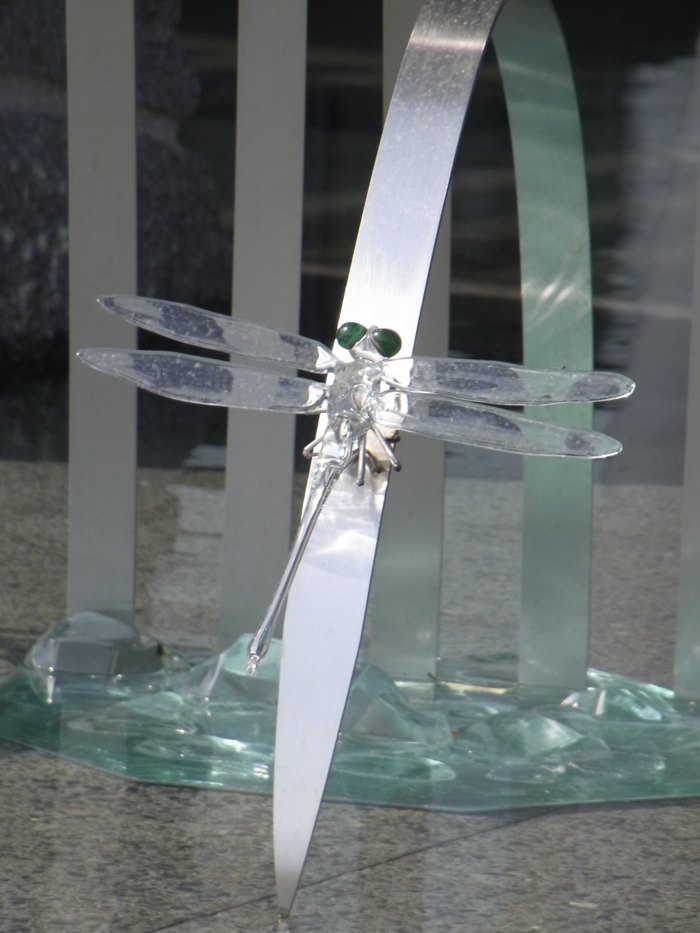稲を模したステンレスの板の上にとまっているのは、ガラスでできた、オニヤンマ。ヤンマーのキャラクターでもあるオニヤンマを各所に添えています。