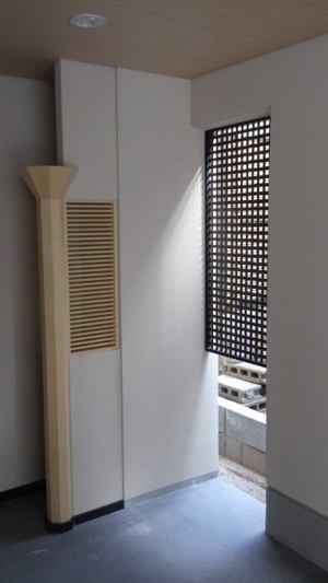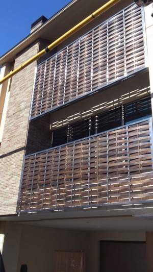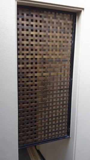 四日市の家 (三重県) <説明> >素材:・真鍮古美色とステンレスのバルコニーパネル・真鍮古美色と鉄枠のパネル・吹きガラスと鍛鉄のブランケット・真鍮古美色とガラスのポスト個人宅のバルコニー・エントランスに真鍮とステンレスの板を編み上げたパネルを設置しました。吹きガラスで作ったランプシェードに鍛造で作り上げたブランケット。真鍮を古色で仕上げ、ガラスをアクセントとしたポストを制作いたしました。